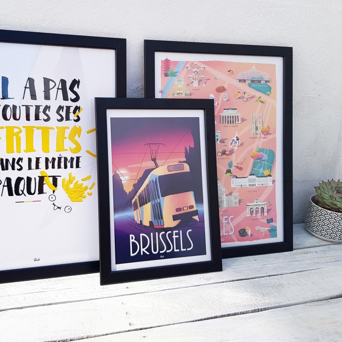 Cadeau de globe-trotteur ou souvenir de voyage en Belgique, la carte de Bruxelles illustre les grands monuments bruxellois, quelques spécialités culinaires comme la bière, les pralines, les gaufres, les cuberdons et les moules-frites ainsi que les célèbres sculptures du Manneken pis ou des Schtroumpfs.